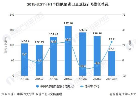 2015-2021年H1中國紙漿進口金額統計及增長情況
