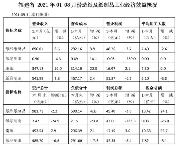 福建省 2021年01-08月份造紙及紙制品工業(yè)經(jīng)濟(jì)效益概況