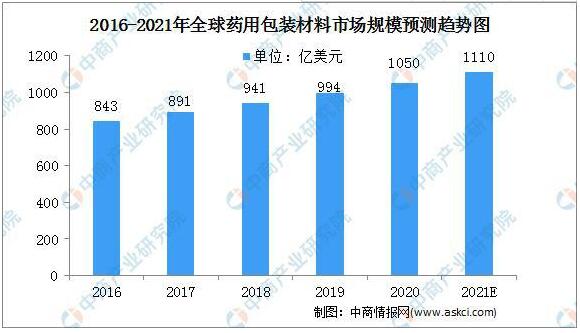 全球藥用包裝材料行業(yè)集中度較高,發(fā)達國家企業(yè)占據了行業(yè)主要市場份額,其產品種類、技術水平、研發(fā)實力均處于行業(yè)領先水平。2018年,全球醫(yī)藥包裝行業(yè)的市場規(guī)模達到941億美元,2016至2018年的年均復合增長率達5.65%,預計2021年將達到1110億美元的市場規(guī)模。