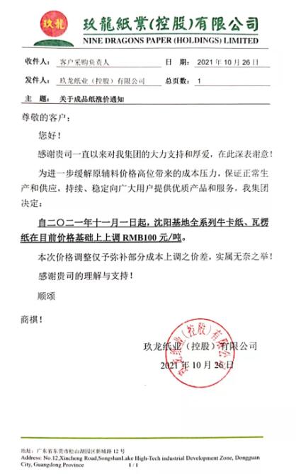 10月26日龍頭企業玖龍紙業(控股)有限公司連發6張漲價函,通知其旗下6大生產基地全系列牛卡紙、瓦楞紙、白面/涂布牛卡紙在原有基礎上上漲100-150元/噸。其中漲幅最大的是太倉基地,統一上調150元/噸,其他基地均上調100元/噸。