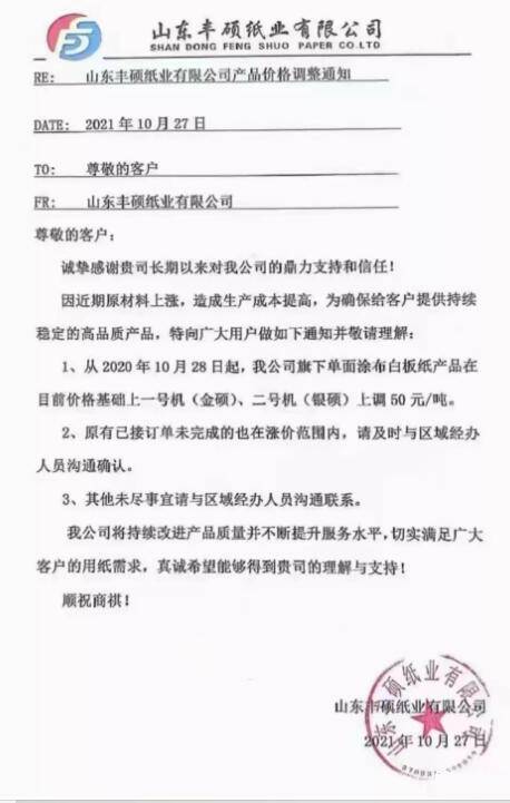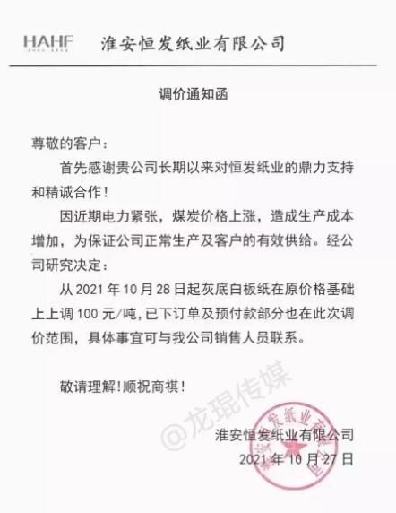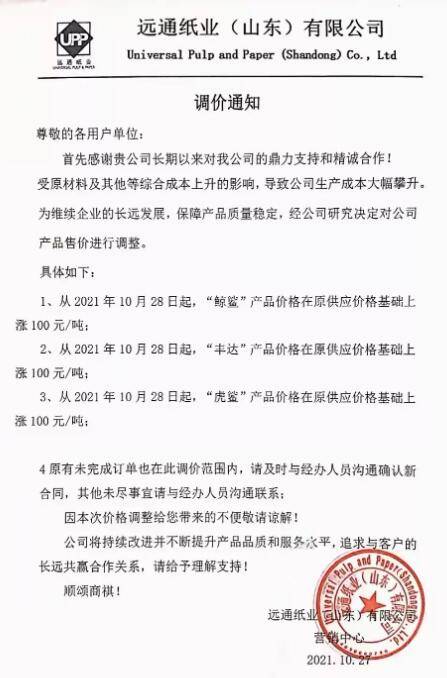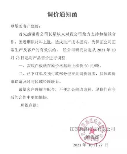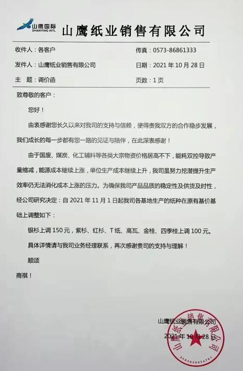 由于國廢、煤炭、化工輔料等各類大宗物資價格居高不下,能耗雙控導致產量縮減,能源成本繼續上張,單位生產成本繼續上升,公司雖努力挖潛提升生產效率仍無法消化成本上漲的壓力。 為確保產品品質的穩定性及供貨及時性,經公司研究決定:自2021年11月1日起,銀杉上調150元/噸,紫杉、紅杉、T紙、高瓦、金桂、四季桂上調100元/噸。 山鷹是國內包裝紙巨頭,年產能坐三望二,其T紙、高瓦產品不必多言,銀杉、紅杉、紫衫均屬于牛皮箱板紙系列,金桂、四季桂分別屬于白面涂布牛卡紙和白面?,幾乎涵蓋紙板生產企業的各類原紙材料。 從上月底至今,山鷹國際與玖龍紙業連續發起了五六輪漲價,且各自發布漲價函的時間僅相差一兩天,不僅步伐一致,漲幅亦十分相近。本次兩家巨頭均提前宣布11月1日再漲100-150元/噸,將進一步提升原紙價位水平,抬高市場上漲預期。 事實上,目前國內就已有多家中小紙廠宣布漲價。比如,江蘇凱盛紙業有限公司、遠通紙業(山東)有限公司、淮安恒發紙業有限公司、山東豐碩紙業有限公司等紙廠就宣布10月28日上調,漲幅為50-100元/噸。 江蘇凱盛紙業有限公司