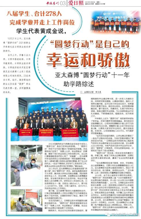 10月25日《黃海晨刊》整版報道 八屆學生、合計278人 完成學業并走上工作崗位 學生代表黃成金說 “圓夢行動”是自己的幸運和驕傲 ——亞太森博“圓夢行動”十一年助學路綜述 10月21日上午,亞太森博“圓夢行動”2021級新生開學典禮在日照職業技術學院舉行。 當天上午,齊魯工業大學、日照市委統戰部、日照市教育局、日照職業技術學院、日照經濟技術開發區管委及亞太森博(山東)漿紙有限公司相關領導,23名來自日照、臨沂、濰坊等地的新生以及往屆“圓夢”學生代表齊聚一堂,共同憧憬美好未來。