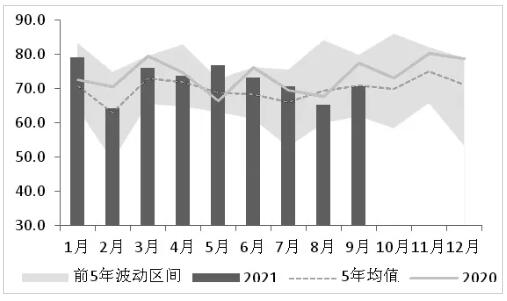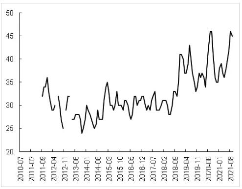△圖為全球針葉漿、闊葉漿出運量 第二,針葉漿庫存水平達到高位。截至2021年9月,全球針葉漿廠家?guī)齑嫣鞌?shù)已到45天,為有數(shù)據(jù)記錄的10年來的最高水平。漿廠去庫迫在眉睫,且去庫壓力的釋放一定會伴隨出運量的階段性增加。從2020年8月類似的情況看,針葉漿可能出現(xiàn)3—6個月的出運量邊際走高。可以預計,2022年年初針葉漿的供應勢必放量。