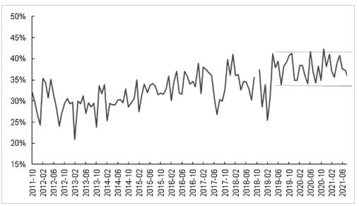 △圖為全球針葉漿廠家?guī)齑?/p> 國內進口量占比相對穩(wěn)定 國內針葉漿90%以上依賴進口。進口量的多寡意味著當期供應量的多寡。2021年,我國紙漿進口量有所下降。截至9月,針葉漿進口量累計同比下降0.8%,闊葉漿進口量累計同比下降3.9%。從全年角度看,針葉漿和闊葉漿進口量在2021年均呈前高后低走勢。 2019年開始,全球針葉漿出運量緩慢下降,而我國針葉漿進口量占全球出運量的比重相對穩(wěn)定。可以看出,第一,我國沒有額外的資源爭奪;第二,我國的針葉漿供應基本跟隨全球市場。根據(jù)前述對出運量的判斷,2022年年初國內針葉漿進口量將增加,但從全年角度來說,依舊保持平穩(wěn)狀態(tài)。
