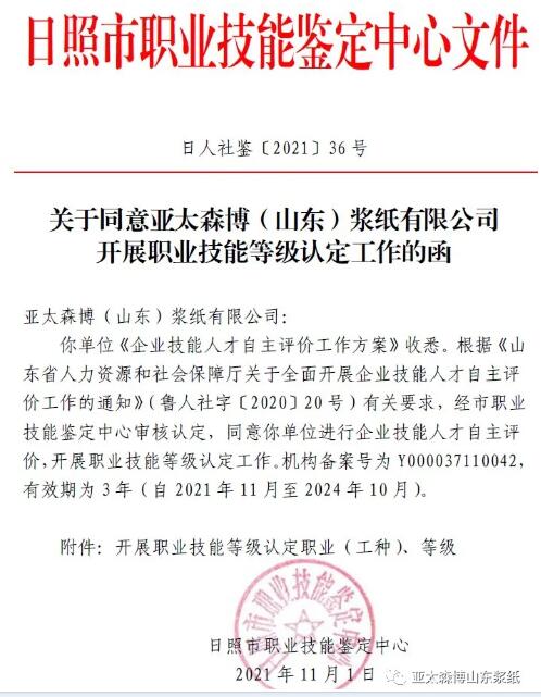 近日,公司收到日照市職業技能鑒定中心《關于同意亞太森博(山東)漿紙有限公司開展職業技能等級認定工作的函》,函件中指出,根據《山東省人力資源和社會保障廳關于全面開展企業技能人才自主評價工作的通知》(魯人社字〔2020〕20號)有關要求,經市職業技能鑒定中心審核認定,同意公司進行企業技能人才自主評價,開展職業技能等級認定工作。 人才評價是人才發展體制機制的重要組成部分,是人才資源開發管理和使用的前提。建立科學的人才分類評價機制,對于樹立正確用人導向、激勵引導人才職業發展、調動人才創新創業積極性、加快建設人才強國具有重要作用。