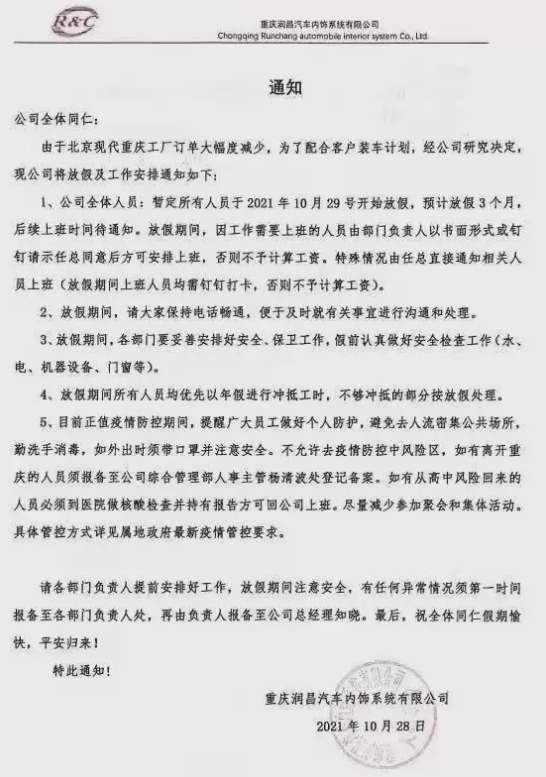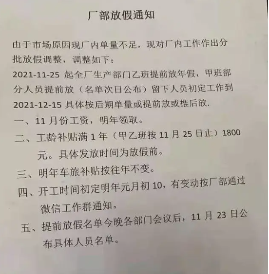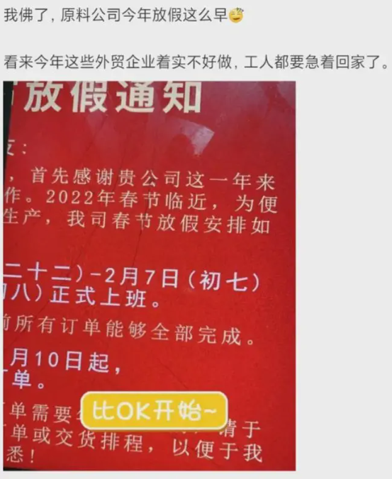 近期,國內疫情零星爆發。 廣東、江蘇、浙江多地局部封控, 全國多地暫時停產停工停業! 疫情催迫下, 大量工廠也提前放假了!  ▶廣東:東莞再增2例本土確診病例 據廣東衛健委網站,12月17日0-24時,全省新增本土確診病例2例,均為東莞報告,1例在納入集中隔離觀察的密接中發現,1例在大規模人群核酸篩查中發現。全省新增境外輸入確診病例5例,其中1例為無癥狀感染者轉確診,廣州報告3例,分別來自老撾、馬來西亞和伊朗;深圳報告2例,均來自美國。新增境外輸入無癥狀感染者3例,深圳報告2例,均來自委內瑞拉;佛山報告1例,來自沙特阿拉伯。新增出院2例,目前在院67例。  根據國家和省關于應對新冠肺炎疫情分區分級防控的工作要求,經東莞市新冠肺炎防控指揮部同意,自2021年12月16日起,大朗鎮大井頭社區大朗碧桂園首座3棟、蔡邊村沙井街76-80號、蔡邊村金麗路五巷20號、蔡邊村九墩區112號、長塘社區第一工業區一街92-146號、長塘社區三區一路197-199號君安雅居、大井頭社區怡安路63號怡安時尚公寓、水平村紅荔西區金寶公寓由低風險地區調整為中風險地區,其他地區風險等級不變。 12月14日起,廣州封閉地鐵5號線淘金站B出入口,管控區域部分公交站點有所調整,暫停防范區內的巡游車、網約車運營。14日6時起,所有從白云機場乘機出發的旅客,在測溫和查驗健康碼的基礎上,須查驗行程碼。  ▶江蘇:部分高速入口關閉 江蘇徐州:停課、高速入口關閉。全市暫停線下教學,徐州周邊徐州南、徐州西、柳新、呂梁、東探收費站入口關閉,出口正常通行,徐州、徐州東、徐州北、漢王、彭城五個收費站正常開通,高速入口查驗48小時核酸檢測證明,請配合疫情防控工作,提前準備核酸檢測報告。 ▶浙江:大廠相繼停產 為遏制疫情擴散,浙江已有多家大型企業宣布停產。截至12月13日,發布了臨時停牌公告的17家A股上市公司中,11家都處于上虞區,主要集中于化工產業、機械零部件等產業。 停產企業如下:  ▶黑龍江:停工停產停業  訥河市發布第51號公告,強化社會面管控。保障社會生活運轉業態,其他業態一律停工停產停業。出租車、公交車、長途客運車輛等公共交通暫停營運。所有民營醫院對現有住院患者封閉管理,停止接診;所有個體診所、門診部、社區衛生服務中心(站)、村衛生所暫停營業。學校、幼兒園及培訓機構實行線上教學。 工廠提前放假!提防貿易商拋貨引發“踩踏風險”! 疫情零星爆發、下游行情慘淡,不少工廠訂單量驟減。多以老客戶翻單訂單、小批量為主,很多工廠訂單稀少,為了節約成本,會提前開啟放假模式。受疫情和市場的影響,今年的放假似乎比之前來得要早一些。    當前貿易商年底資金壓力急劇增加,需要警惕貿易端拋售庫存引發的“踩踏風險”。 塑料供應商老板突然跑路引發賣家熱議近日,還有一則爆料稱,中山市某塑料廠老板突然跑路,毫無征兆,給了員工當頭一棒。據員工發視頻爆料,前一天晚上加班還好好的,第二天一早上班發現人去樓空,老板跑路了,并且還欠員工三個月的工資沒發。  視頻中,員工用紅色的幾個大字表達著不滿:“因為信任,往往容易被騙”“老板你的良心不會痛嗎?”  從視頻截圖中可以看到,公司里一片混亂,只剩下一些沒使用完的材料和工具。此消息一出,引來了眾多賣家關注,大家都對該公司老板表達了譴責之意。“這樣做老板,估計一輩子都發不了財。得民心者得天下。失民心者失天下。格局還是太小了。”“永遠不要跟資本家談良心!跟員工談理想的老板底子都虛,記住,不管什么糖衣炮彈,自己出力就是為了掙錢!”圖片  其實,要不是實在沒辦法了,老板也不會一走了之,在網格化管理與視頻監控之下,沒有哪個老板真正能跑得掉的。在疫情擾動的兩年時間,老板們承受的痛苦不可想象,說多了都是淚。不過,背負著房貸車貸的打工者也不容易,就算公司要倒閉解散,老板也應該考慮到大家共事一場,給員工一個交代。受疫情影響,各行各業都不景氣,中小企業的境況更加艱難,不是每個企業老板都能做到善始善終的。