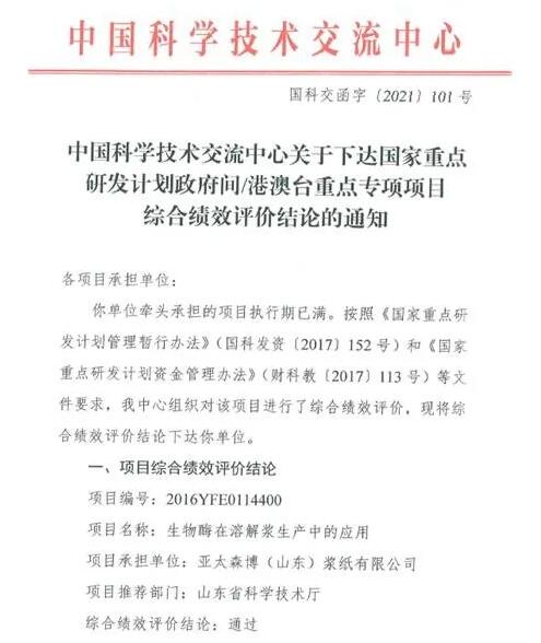 近日,中國科學技術交流中心公布《關于下達國家重點研發計劃政府間/港澳臺重點專項項目綜合績效評價結論的通知》(國科交函字[2021]101號),亞太森博牽頭承擔完成的《生物酶在溶解漿生產中的應用》項目順利通過績效評價。評價專家組認為項目完成了任務書中規定的研究內容,達到了預期指標,建議通過驗收。