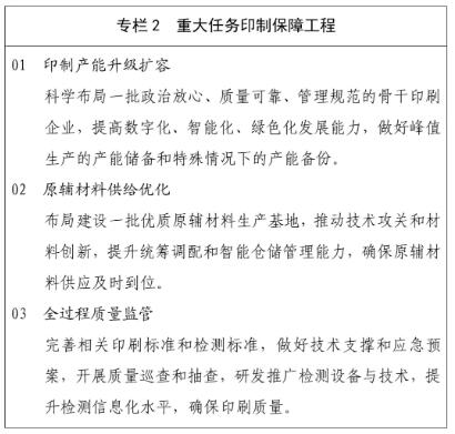 (二)高水平保障重大任務和重點產品印制。落實意識形態工作責任制,強化政治自覺,加強組織領導,高質量做好領袖著作、黨的創新理論研究闡釋讀物、黨和國家重要文件文獻等重大主題出版物以及各級黨報黨刊、重點應急印刷品的印制工作。加強統籌協調,優化產能和時間配置,保質保量完成中小學教科書和高校思政課教材的印制任務。