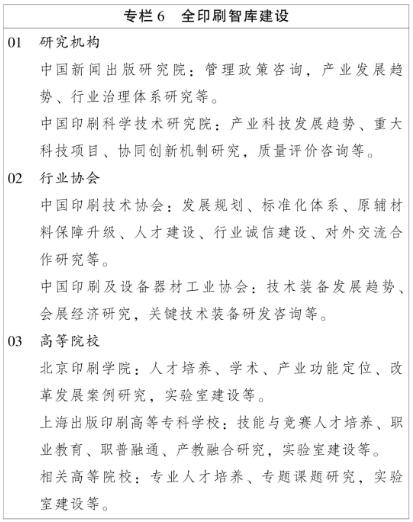 五、加快推進區域協調發展 貫徹區域協調發展戰略,深化落實北京、長三角、珠三角三個升級指南要求,引導支持各地出臺有關政策,形成特色鮮明、優勢互補,融合互動、全面升級的新型產業布局。 。ㄒ唬┙ㄔO京津冀協同發展先行區。緊貼保障首都核心功能任務要求,完善京津冀出版物印刷保障體系建設,發布三地出版物印刷協同保障企業名單。實現京津冀印刷資質互認,提升三地協同監管信息化水平。推動京津冀聯合出臺印刷業區域布局政策指引,建設認定一批協同發展先行示范基地,打造若干協同發展交流合作平臺。建設全國印刷業創意設計中心、印刷物流集散基地、新材料研發中心。 (二)建設長三角一體化創新高地。出臺長三角印刷業一體化發展升級的創新中心、先進產業集群和優勢企業名單。以上海為龍頭,引領科技創新和國際交往;以江蘇和浙江為重點,深化轉型升級和綠色發展;以安徽為支撐,加快產業承接和特色發展。推動長三角三省一市建立發展協商機制和資源對接平臺,統籌設計制度政策,打造一批區域創新發展集群,加快構建產業發展生態圈。 (三)建設珠三角印刷業高水平對外開放連接平臺。加強粵港澳用產學研協同發展,建設連接國內外的印刷業務信息服務系統,推動成立印刷標準化交流促進中心和印刷文化交流研究中心,培育數字印刷、印刷智能制造和印刷戰略新興等三類產業集群,鞏固提升珠三角九市印刷業比較優勢和綜合協同優勢。出臺珠三角印刷業對外開放連接平臺建設的核心單位名單和重點項目名單。 。ㄋ模┰鰪娞荻劝l展韌性。鼓勵支持西部地區發展數字印刷、紙包裝印刷、印刷裝備制造和印刷原輔材料,提升出版物印刷基礎發展水平。鼓勵支持東北地區發展出版物印刷、包裝印刷和印刷軟件服務,培育新興特色印刷。鼓勵支持中部地區建設一批中高端產業集群,積極承接優質印刷產業布局和轉移。鼓勵支持區域合作互助,推動東部龍頭骨干企業在東北地區和中西部地區投資興業,有效服務鄉村振興戰略。鼓勵支持革命老區、民族地區因地制宜發展特色印刷。鼓勵支持邊境地區建設區域性印刷業對外開放連接平臺。 六、全面提高對外開放合作水平 深化印刷業對外開放合作,加強安全保障,形成全印刷、高水平、可持續的對外開放新格局。 。ㄒ唬┙ㄔO國際印刷技術交流合作平臺。統籌推進各類開放平臺建設,鼓勵支持辦好北京國際印刷技術展覽會、中國國際全印展等重點展會,發揮珠三角對外開放連接平臺引領帶動作用,鼓勵支持行業協會、高等院校、研究機構和骨干企業共同打造高端合作交流平臺。鼓勵支持骨干企業參加世界大展。建立健全“一帶一路”印刷信息合作網絡,探索建設“一帶一路”印刷產能技術交流合作平臺。 。ǘ┨岣摺白叱鋈ァ焙汀耙M來”的質量水平。促進國內國際雙循環。支持龍頭骨干和特色印刷企業、印刷裝備器材企業走出去。支持兩岸四地印刷業深化合作,共同開拓國際市場。推動對外加工貿易高質量、差異化、創新性發展,拓展第三方市場合作。擴大先進技術和重要裝備進口,推動進口來源多元化,引導外資更多投向數字印刷和綠色原輔材料等領域,引導外資更多投向中西部地區。發展“走出去”和“引進來”的信息平臺。 (三)增強印刷領域國際話語權。加強產業發展與治理國際溝通交流,依托世界印刷與傳播論壇、亞太印刷技術論壇等國際組織,提出更多的中國方案,合力推動全球印刷業健康可持續發展。承擔好國際標準化組織印刷技術委員會秘書處及主席的工作。推動我國優勢印刷技術標準成為國際標準,弘揚傳播中華優秀印刷文化。建立健全安全審查和風險預警防范體系。 七、加強人才建設 貫徹落實新時代人才強國戰略,加強全印刷領域思想政治引領和專業素質提升,尊重勞動、尊重知識、尊重人才、尊重創造,建設愛黨報國、敬業奉獻、結構合理、能干善創的高素質人才隊伍。 (一)完善全印刷智庫建設。圍繞大局大事和重大需求,開展前瞻性、針對性、儲備性研究,建設特色鮮明、規模適度的印刷智庫。支持研究機構在決策咨詢、產業發展、標準制定等方面發揮更大作用,支持行業協會建設專題數據庫,支持高等院校建設相關實驗室,支持骨干企業興辦技術研究應用基地。培育具有國際影響力的印刷智庫。建立運行規范、充滿活力、監管有力的智庫管理體制。