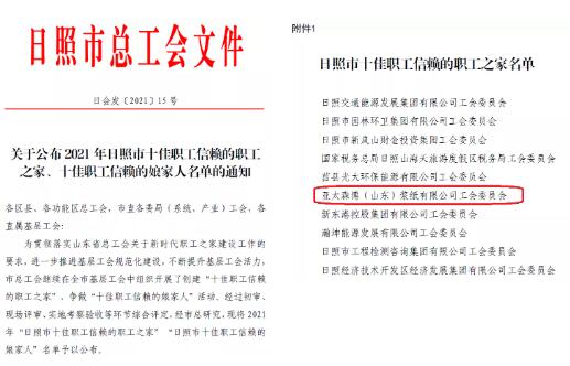 2021年9月,市總工會發布了《關于繼續在全市組織開展“雙十佳”創建活動的通知》,公司工會根據要求積極推薦申報,經過市總初審、現場評審、網絡投票、到公司考察驗收等多項嚴苛的評選程序,最終公司被命名為“日照市十佳職工信賴的職工之家”,同時公司也被推薦認定“日照市五一先鋒單位”,市總工會給予5萬元工作經費補助。