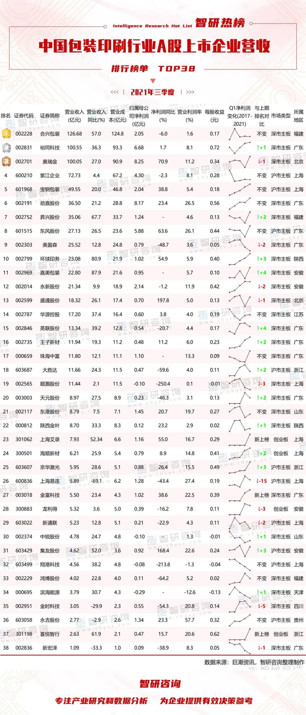 為研究中國各行各業A股上市企業披露的營收及相關利潤情況,智研咨詢數據中心推出《智研熱榜:2021年三季度中國包裝印刷行業A股上市企業營收排行榜單TOP38》,以供參考。 榜單解讀: 2021年三季度中國包裝印刷行業共有38家(截至2022年1月14日)A股上市企業披露三季報,總計營收836.5億元,同比增長3.16%(2020Q3共有43家包裝印刷上市企業),總計歸屬母公司凈利潤57.8億元,同比下降2.81%。38家包裝印刷上市企業主要分布在廣東(10家)、上海(8家)、安徽(4家)、福建(3家)、浙江(3家),其中深市主板(24家)、滬市主板(10家)、創業板(4家)。 依據榜單可知,合興包裝營收約為126.7億元,營收同比增長57%,占整個包裝印刷行業上市企業總營收的15.14%,再度蟬聯榜單TOP1。34家企業營收同比呈現不同程度增長,嘉美包裝同比增長幅度最大(87.9%),4家企業營收同比有所下滑,上海易連下降幅度最大(69.1%)。就榜單營收與2020年三季度排名變化情況來看,14家企業排名有所上升,英聯股份上升了4名(最大),10家企業排名有所下降,上海易連從11名下降到了26名,下降名次最多,11家企業排名未發生變化,上海艾錄、金富科技、喜悅智行這3家企業新上榜。 從營業成本來看,4家企業高于50億元,有5家企業成本高于營收;這38家包裝印刷行業上市企業營業利潤率的中位數約為6.9%,永吉股份營業利潤率最高為57.7%,濱海能源營業利潤率最低。從每股收益來看,裕同科技每股收益最高為0.72元(截至1月17日09:30:00股價為32.96元,市盈率(TTM)為27.11),喜悅智行每股收益為0.62元(截至1月17日09:30:00股價為35.69元,市盈率(TTM)為54.78),32家企業每股收益在0-0.6元之間,4家企業每股收益為負值。 從凈利潤來看,34家企業歸屬母公司凈利潤處于盈利狀態,4家企業歸屬母公司凈利潤出現虧損;凈利潤盈利最大的企業為奧瑞金(8.2億元),濱海能源歸屬母公司凈利潤虧損高達0.3億元;盛通股份歸屬母公司凈利潤同比增長幅度最大(197.8%),順灝股份歸屬母公司凈利潤同比下降幅度最大;京華激光、海順新材、環球印務、王子新材、寶鋼包裝這5家企業第三季度的凈利潤逐年遞增,18家企業每年第3季度的凈利潤不斷波動,2021年有所下滑,15家企業每年第3季度的凈利潤不斷波動,2021年有所增長。