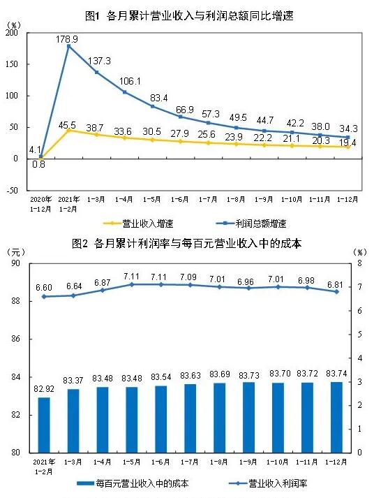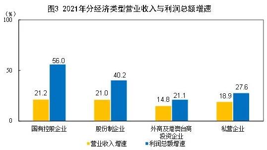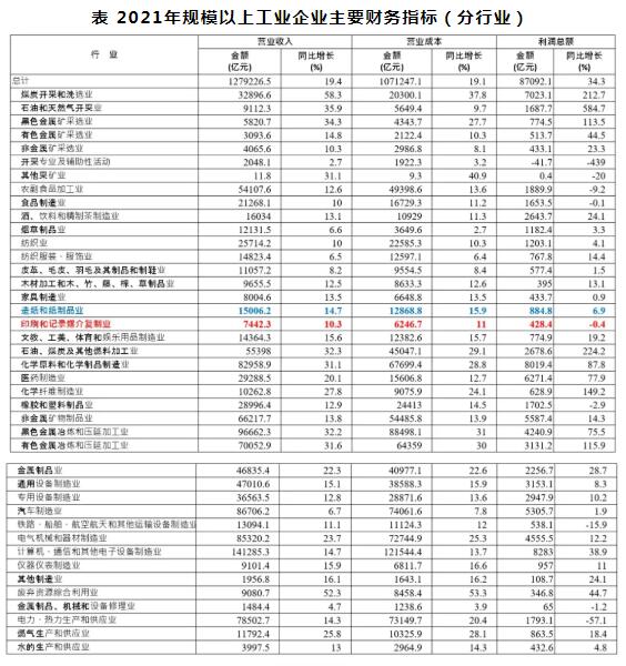 1月27日,國家統(tǒng)計局網(wǎng)站發(fā)布了2021年全國規(guī)模以上工業(yè)企業(yè)利潤數(shù)據(jù)。數(shù)據(jù)顯示,2021年全國規(guī)模以上工業(yè)企業(yè)利潤增長34.3%,兩年平均增長18.2%。 2021年,全國規(guī)模以上工業(yè)企業(yè)實現(xiàn)利潤總額87092.1億元,比上年增長34.3%,比2019年增長39.8%,兩年平均增長18.2%。 2021年,規(guī)模以上工業(yè)企業(yè)中,國有控股企業(yè)實現(xiàn)利潤總額22769.7億元,比上年增長56.0%;股份制企業(yè)實現(xiàn)利潤總額62702.2億元,增長40.2%;外商及港澳臺商投資企業(yè)實現(xiàn)利潤總額22845.5億元,增長21.1%;私營企業(yè)實現(xiàn)利潤總額29150.4億元,增長27.6%。 2021年,采礦業(yè)實現(xiàn)利潤總額10390.8億元,比上年增長1.91倍;制造業(yè)實現(xiàn)利潤總額73612.2億元,增長31.6%;電力、熱力、燃氣及水生產(chǎn)和供應(yīng)業(yè)實現(xiàn)利潤總額3089.2億元,下降41.9%。 2021年,在41個工業(yè)大類行業(yè)中,32個行業(yè)利潤總額比上年增長,8個行業(yè)下降,1個行業(yè)由盈轉(zhuǎn)虧。 2021年,規(guī)模以上工業(yè)企業(yè)實現(xiàn)營業(yè)收入127.92萬億元,比上年增長19.4%;發(fā)生營業(yè)成本107.12萬億元,增長19.1%;營業(yè)收入利潤率為6.81%,比上年提高0.76個百分點。 2021年末,規(guī)模以上工業(yè)企業(yè)資產(chǎn)總計141.29萬億元,比上年增長9.9%;負債合計79.23萬億元,增長9.6%;所有者權(quán)益合計62.06萬億元,增長10.2%;資產(chǎn)負債率為56.1%,比上年降低0.1個百分點。 2021年末,規(guī)模以上工業(yè)企業(yè)應(yīng)收賬款18.87萬億元,比上年增長13.3%;產(chǎn)成品存貨5.40萬億元,增長17.1%。 2021年,規(guī)模以上工業(yè)企業(yè)每百元營業(yè)收入中的成本為83.74元,比上年減少0.23元;每百元營業(yè)收入中的費用為8.59元,比上年減少0.59元。 2021年末,規(guī)模以上工業(yè)企業(yè)每百元資產(chǎn)實現(xiàn)的營業(yè)收入為95.4元,比上年增加7.7元;人均營業(yè)收入為172.0萬元,比上年增加28.4萬元;產(chǎn)成品存貨周轉(zhuǎn)天數(shù)為16.8天,比上年減少0.9天;應(yīng)收賬款平均回收期為49.5天,比上年減少2.0天。 2021年12月份,規(guī)模以上工業(yè)企業(yè)實現(xiàn)利潤總額7342.0億元,同比增長4.2%。