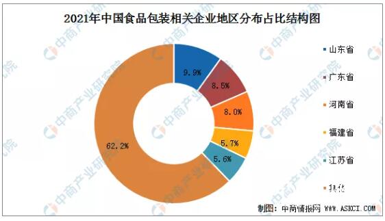數據來源:中國包裝聯合會、中商產業研究院整理 3、食品包裝企業地區分布 從我國食品包裝行業產業鏈企業區域分布來看,行業企業在全國絕大多數省份均有分布,其中山東省食品包裝企業數量分布最多,為34921家,占比9.9%;同時廣東、安徽等省份企業數量也相對集中,分別為8.5%和8%。