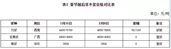 春節(jié)假期期間竹漿、甘蔗漿以及草漿部分企業(yè)停機(jī)放假,市場交投基本停滯,節(jié)后隨著部分產(chǎn)線復(fù)工,非木漿開工小幅提升。但下游部分紙廠仍處于放假模式,需求跟進(jìn)不足,實(shí)單放量有限。而進(jìn)口木漿市場受到紙漿期貨帶動,報(bào)盤較節(jié)前上行,支撐非木漿市場心態(tài)。