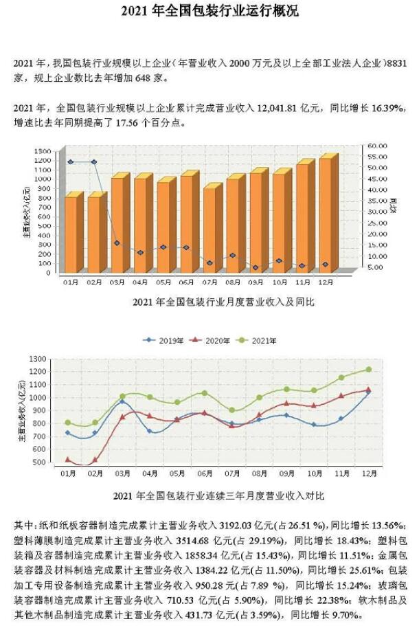2月22日,中國包裝聯(lián)合會公布了2021年全國包裝行業(yè)運行概況。2021年,我國包裝行業(yè)規(guī)模以上企業(yè)(年營業(yè)收入2000萬元及以上全部工業(yè)法人企業(yè))8831家,規(guī)上企業(yè)數(shù)比去年增加648家。