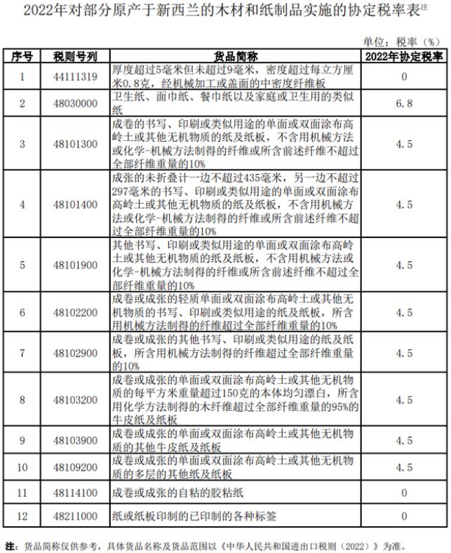 為履行《升級議定書》及相關(guān)換文規(guī)定,國務(wù)院關(guān)稅稅則委員會發(fā)布公告,自4月7日起對部分原產(chǎn)于新西蘭的木材和紙制品稅目實施協(xié)定稅率,后續(xù)年度稅率自當年1月1日起實施。