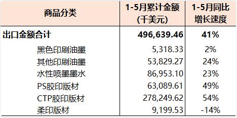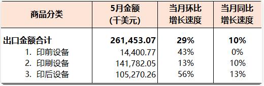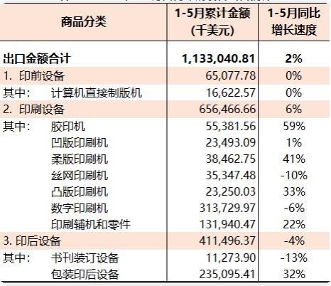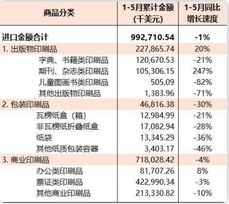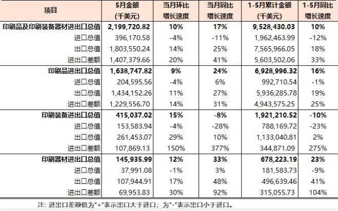 2022年1-5月國內印刷器材進出口貿易順差3.15億美元(同比增長104%)。 本期觀察 2022年1-5月國內印刷產業相關商品進出口同比增長10%,與上期(1-4月)相比,提升了2個百分點。而拉動其提升的主要動力來自印刷品、印刷裝備、印刷器材三大類商品的出口增長。 本期,國內印刷產業相關商品進出口貿易特點如下: 三大類商品進口速度相對萎縮的態勢未見根本改觀:1-5月份,國內印刷產業相關商品進口同比下降12%。其中,印刷品進口同比下降1%(較上期上升2個百分點)、印刷裝備同比下降23%(較上期降低2個百分點)、印刷器材同比下降9%(較上期提高2個百分點)。 印刷品、印刷器材出口繼續大幅增長、印刷裝備出口增長速度由負轉正:1-5月份,國內印刷品和印刷器材的出口同比增長速度分布為19%和41%。同時,國內印刷裝備出口由上期的負增長(-1%)轉變為正增長(2%)。 亞洲、歐洲和北美的市場穩固,拉美和非洲市場增長顯著:1-5月份,國內印刷品、印刷裝備、印刷器材進出口在亞洲、歐洲和北美洲三大區域市場的分布相對穩定(亞洲43%、歐洲22%、北美洲24%)。與去年同期相比三個市場相關進出口增長情況為,亞洲2%、歐洲10%、北美洲增長19%。同時,在拉丁美洲和非洲市場,國內印刷產業相關商品進出口表現亮眼,其增長速度分別達到35%和16%。 與2021年同期相比,2022年1-5月國內印刷品、印刷裝備、印刷器材進口和出口增長較快的前五個商品商品類別如下: 進口:期刊及雜志類印刷品(+247%)、PS膠印版材(+125%)、柔版印刷機(+42%)、辦公類印刷品(+8%)、水性噴墨墨水(+1%); 出口:膠印機(+59%)、CTP膠印版材(+54%)、PS膠印版材(+49%)、柔版印刷機(+41%)、紙袋(+34%)。 同期,國內印刷品、印刷裝備、印刷器材進口和出口相對萎縮的前五個商品商品類別如下: 進口:凸印機(-98%)、兒童圖畫書類印刷品(-82%)、CTP膠印版材(-78%)、其他出版物印刷品(-71%)、包裝印后設備(-55%); 出口:其他出版物印刷品(-62%)、票證類印刷品(-58%)、期刊及雜志類印刷品(-39%)、柔印版材(-14%)、書刊裝訂設備(-13%)。