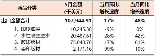 2022年5月國內印刷器材出口1.08億美元(參見表7),環比增長17%、同比增長48%。其中,印刷油墨出口1024.54萬美元(環比下降9%、同比增長0%)、水性噴墨墨水出口2048.76萬美元(環比增長28%、同比增長42%)、膠印版材出口7504.08萬美元(環比增長17%、同比增長61%)、柔印版材出口217.12萬美元(環比增長99%、同比增長10%)。 表7 2022年5月國內印刷器材出口統計