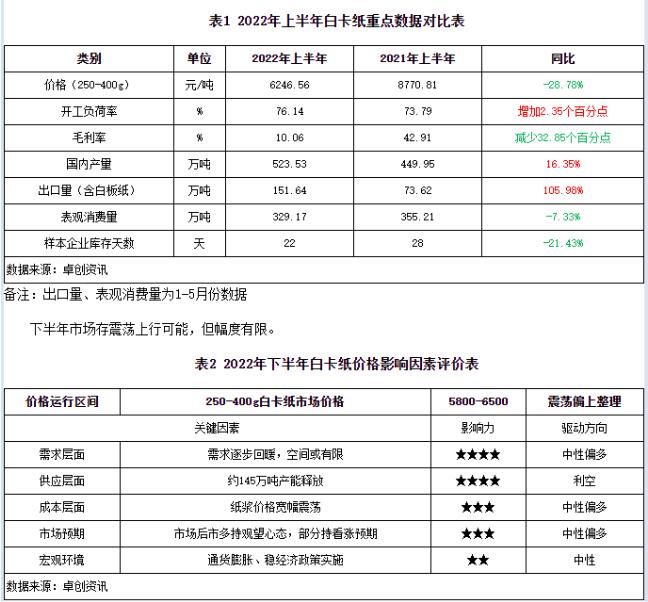 影響上半年市場走勢的因素包括以下四個方面: 一是,全球經濟下行壓力較大,國內穩經濟形勢下,疊加不確定因素對市場供應鏈的影響,市場需求整體偏弱;二是,多方因素影響下能源價格上漲形成一把雙刃劍,帶動原燃料成本上漲的同時,催生國外紙張供應緊張、價格上漲,從而對國內出口提升帶來刺激作用;三是,產能釋放加大市場競爭,供大于求的現狀沒有改善;四是,市場景氣度不高,貨物及資金周轉放緩,市場整體運行承壓,對心態形成抑制。具體表現如下: 市場需求整體偏弱,旺季回歸不及預期。一季度市場需求恢復步伐被不可控因素打亂,尤其是3月中旬開始多地物流運輸不暢,部分下游出現停工,理論需求旺季表現不旺。作為重要消費市場的長三角地區,供應鏈恢復緩慢,部分區域長達2個多月的物流受阻,不僅造成本區域訂單流失,且對外圍亦形成輻射影響。上半年市場需求整體表現較弱,1-5月表觀消費量329.17萬噸左右,同比減少7.33%左右。市場貨物及資金周轉率減緩,下游印刷及包裝廠運營壓力增加,并伴隨著市場信心的不足,市場承壓下行。 原料成本高位運行,行業盈利收窄。進口木漿現貨市場上半年維持先揚后抑態勢,上半年進口木漿現貨均價高于去年同期均價,價格再創新高。以針葉漿為例,據卓創資訊監測數據顯示,2022年上半年進口針葉漿均價6914.77元/噸,同比上漲2.28%;5月初高點7478.57元/噸左右,較1月的低點6032.14元/噸上漲23.98%。主要原料木漿價格上漲,帶動上半年白卡紙成本增長至高位,1-6月木漿成本較去年同期上漲16.09%,加之白卡紙價格同比下跌28.78%,1-6月行業毛利率較去年同期減少32.85個百分點。由于生產成本承壓,上半年規模企業連發漲價函6次左右,但在偏弱需求背景下,紙價并不能順利向下傳導。 市場供應增加,出口增加減緩內銷壓力。上半年生產企業除個別產線檢修外,普遍維持正常開工。雖然山東地區年產30萬噸新增產能并未如期釋放,但廣西地區兩條年產各90萬噸產線陸續達產后,對市場投放量增加。上半年,白卡紙產量較去年同期增加73.58萬噸至523.53萬噸,但出口較去年同期增加83.41萬噸,出口增量大于產量增量約 9.83萬噸。由于出口表現良好,企業內銷壓力得到緩沖,6月末主流企業庫存低于去年同期。但在二季度需求明顯疲軟的行情下,出口增速回落對市場的利好帶動作用有所減弱。