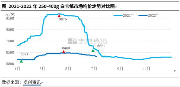導語:2022年上半年白卡紙市場走勢先漲后跌,整體波動幅度較去年同期明顯收窄,原料成本高位及出口良好對市場起到利好支撐。但內需表現低于預期,隨著二季度行業淡季加深,需求逐漸成為影響市場走勢的關鍵因素。下半年伴隨著需求回暖,以及在高成本、低利潤背景下市場存承壓拉漲可能,但同時供應端放量,市場供需改善有限,預計整體市場上行空間不大。 市場走勢符合淡旺季特點,但波動幅度不大。上半年白卡紙市場走勢先漲后跌,以5月作為分界點,1-4月市場上行為主,5-6月陸續下跌。據卓創資訊數據顯示,2022年上半年250-400g白卡紙市場均價6246.56元/噸,較去年同期下跌2524.25元/噸,跌幅28.78%。市場高點出現在4月中下旬6460元/噸,低點出現在6月底6200元/噸,高低價差260元/噸,波動幅度4%左右。與去年同期相比,2022年上半年調整幅度明顯收窄,而2021年上半年高低價波動幅度達到31%左右。