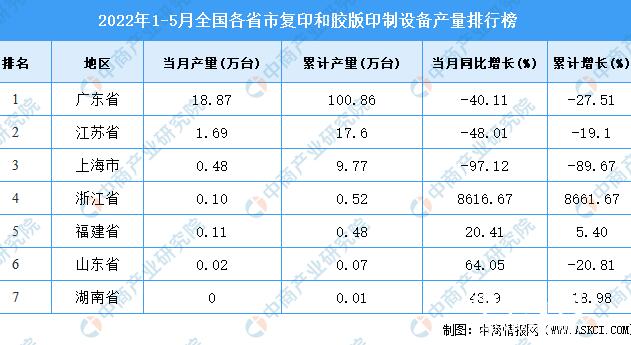 2022年1-5月廣東省復(fù)印和膠版印制設(shè)備產(chǎn)量排名第一,累計(jì)產(chǎn)量為100.86萬臺。