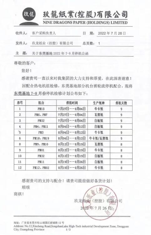 隨著東莞玖龍宣布停機檢修,山鷹國際、東莞理文、東莞金洲等大批紙廠的停機公函也已露出水面。一場規模浩大的“停機潮”,正在華南地區逐步上演。 多家造紙巨頭發布停機計劃 7月26日,東莞玖龍紙業宣布,旗下14臺紙機將在7月27日-8月26日輪流停機減產。該消息一經發出,便迅速傳遍整個造紙及包裝行業。