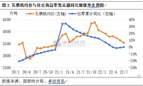 下游需求持續疲軟 瓦楞及箱板紙終端消費品與經濟息息相關,同樣受內需不足、出口放緩的影響,需求端整體承壓。圖2數據顯示,瓦楞紙與社會商品零售總額同比增長率走勢保持高度相似性,據國家統計局數據顯示,1月份至7月份,社會消費品零售總額246302億元,同比下降0.2%。社會消費品零售總額同比增速不及市場預期,對包裝紙需求形成一定抑制,瓦楞及箱板紙市場也表現出了“旺季不旺、淡季更淡”的特征。受需求端持續疲軟影響,市場延續供大于求格局,導致紙價承壓偏下運行。