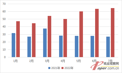 據紙業觀察網統計,2022年前7月,機制紙及紙板出口量均與2021年同期相比呈現大幅增長態勢。