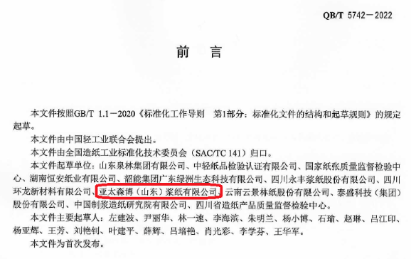 公司高度重視標(biāo)準(zhǔn)化工作,積極參加國家、行業(yè)、地方標(biāo)準(zhǔn)的制修訂工作。近年來,公司先后主導(dǎo)起草了QB/T 1678-2017《漂白硫酸鹽木漿》行業(yè)標(biāo)準(zhǔn)、QB/T 5568-2021《造紙工業(yè)能源檢測與評價方法 蒸煮系統(tǒng)》行業(yè)標(biāo)準(zhǔn)、QB/T 5569-2021《造紙工業(yè)能源檢測與評價方法 漂白系統(tǒng)》行業(yè)標(biāo)準(zhǔn);參與起草了GB/T 10335.3-2018《涂布紙和紙板 涂布白卡紙》國家標(biāo)準(zhǔn)、QB/T 1022-2021《制漿造紙企業(yè)綜合能耗計算細(xì)則》行業(yè)標(biāo)準(zhǔn)、DB37/T 4065.1-2020《自制木漿造紙綠色工廠評價規(guī)范 第1部分:自制木漿造紙》地方標(biāo)準(zhǔn)。公司充分發(fā)揮標(biāo)準(zhǔn)的規(guī)范、引領(lǐng)、提升作用,以標(biāo)準(zhǔn)化助推企業(yè)的轉(zhuǎn)型升級與高質(zhì)量發(fā)展。