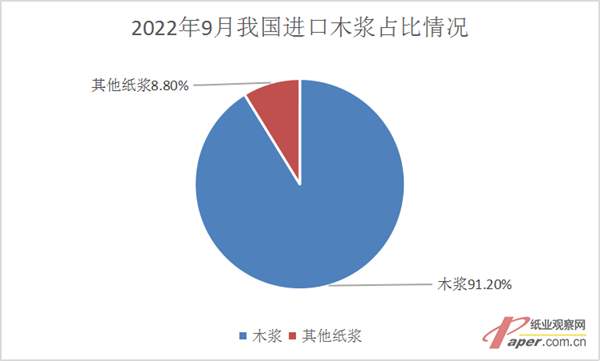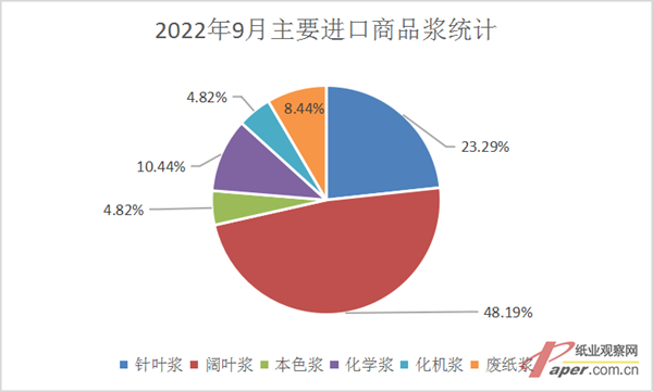 從細分市場來看,9月針葉漿進口量為57.68萬噸,占紙漿總量的23.29%,進口量同比下降18.31%,進口額為56627.92萬美元,同比下降10.31%;闊葉漿進口量為120.21萬噸,占紙漿總量的48.19%,同比增長36.74%,進口額為96858.89萬美元,同比增長65.97%;本色漿進口量為12.39萬噸,占紙漿總量的4.82%,同比增長61.22%,進口額為10486.25萬美元同比增長70.28%;化學漿進口量為25.97萬噸,占紙漿總量的10.44%,同比下降3.82%,進口額為31058.99萬美元,同比增長5.81%;化機漿進口量為12.05萬噸,占紙漿總量的4.82%,同比下降4.01%,進口額為8407.36萬美元,同比增長19.79%;廢紙漿進口量為21.42萬噸,占紙漿總量的8.44%,同比下降14.07%,進口額為9258.22萬美元,同比下降19.29%。