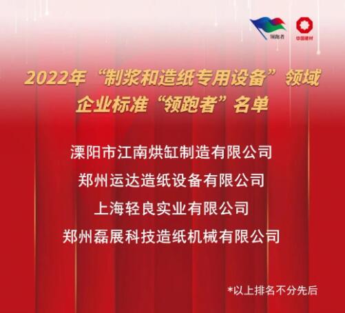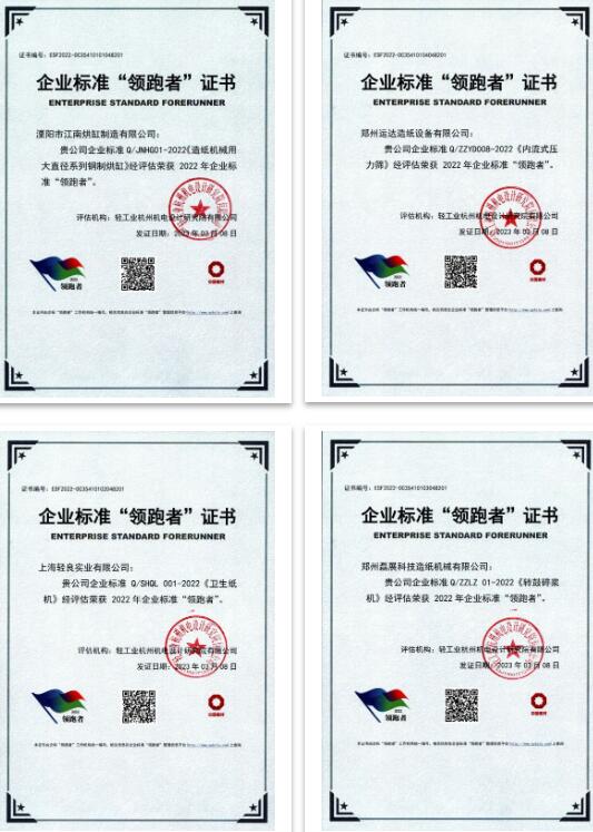溧陽市江南烘缸制造有限公司、鄭州運(yùn)達(dá)造紙?jiān)O(shè)備有限公司、上海輕良實(shí)業(yè)有限公司、鄭州磊展科技造紙機(jī)械有限公司等4家企業(yè)在公示期無異議后分別榮獲鋼制烘缸、壓力篩、衛(wèi)生紙機(jī)、鼓式碎漿機(jī)2022年企業(yè)標(biāo)準(zhǔn)“領(lǐng)跑者”。 獲得企業(yè)標(biāo)準(zhǔn)“領(lǐng)跑者”稱號(hào)的企業(yè),表明其產(chǎn)品或服務(wù)的核心指標(biāo)高于國家標(biāo)準(zhǔn)和行業(yè)標(biāo)準(zhǔn),達(dá)到國內(nèi)乃至國際先進(jìn)水平。企業(yè)可登錄企業(yè)標(biāo)準(zhǔn)領(lǐng)跑者管理信息平臺(tái)(https://www.qybzlp.com )查詢并下載企業(yè)標(biāo)準(zhǔn)“領(lǐng)跑者”證書。