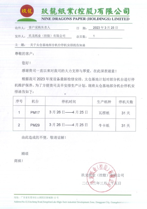 令人意外的是,此前宣布PM8紙機將從3月18日起停機56天的太倉玖龍紙業,本次再度宣布了停機計劃。兩臺紙機PM17、PM29均在3月26日-4月25日期間停機31天,所減產的紙種分別為瓦楞紙、牛卡紙。