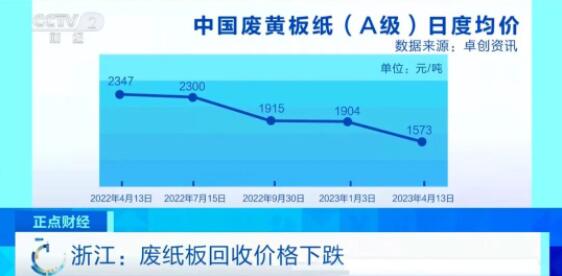 數(shù)據(jù)顯示,截至4月13日,國內A級廢黃板紙報價每噸1573元,較去年同期水平每噸2347元,跌幅超30%,是近五年來的最低位。業(yè)內人士表示,廢紙板的定價往往取決于下游的造紙廠。在成品紙行情好的時候,廢紙回收價格也會隨之上行;然而去年成品紙的終端需求較弱,導致造紙廠庫存高企,生產(chǎn)需求下降,因此調低了廢紙的采購價格和回收總量。 上海:造紙企業(yè)加速去庫存 二季度業(yè)績有望迎來修復 記者在采訪中了解到,使用廢紙作為原料的一般是生產(chǎn)箱板瓦楞紙等工業(yè)包裝用紙的企業(yè)。廢紙價格下行很大一部分原因是這類造紙企業(yè)為了調節(jié)利潤做出的舉措。目前紙企的經(jīng)營情況怎么樣?廢紙價格下跌,對于紙企的盈利能力是否有改善? 在箱板瓦楞紙的生產(chǎn)中,廢紙的成本占比高達70%。業(yè)內人士表示,正常來講紙企的凈利潤在每噸300到400元左右,而從去年開始,因為木漿、廢紙等原材料價格大漲和終端需求低迷,紙企已經(jīng)面臨虧損。根據(jù)部分上市公司紙企發(fā)布的業(yè)績預告來看,歸母凈利潤普遍大幅下滑。 上海某紙業(yè)股份有限公司副總裁 嚴大林:成品紙的價格往下跌(每噸)300元左右,之前我可能可以賣大概4500元一噸的價格,現(xiàn)在目前只能4200元以下去賣。為了企業(yè)能夠保證一定的現(xiàn)金利潤,我不得不把廢紙的采購價格壓低。 今年一季度以來,造紙原材料木漿的價格出現(xiàn)松動。4月13日針葉漿報價每噸5953元,相比去年同期每噸7040元,同比下跌15.4%,并且周環(huán)比跌幅仍在擴大。可以看出造紙產(chǎn)業(yè)成本端壓力正在緩解。