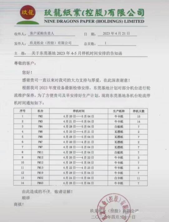 東莞玖龍紙業(yè)最新停機(jī)計(jì)劃來(lái)襲!4月21日,東莞玖龍紙業(yè)發(fā)布4-5月停機(jī)時(shí)間安排,11臺(tái)紙機(jī)將在4月20日-5月4日期間輪流停機(jī)2-15天,涉及牛卡、瓦楞、白板、白卡等包裝紙類。