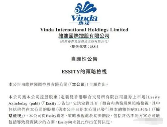 近日,維達(dá)國際(03331.HK)的控股股東瑞典Essity AB(愛適瑞)公布,正考慮出售維達(dá)大部分股份,據(jù)稱Essity正在討論出售部分或手上全部51.59%的維達(dá)股權(quán)。 Essity于4月26日宣布為達(dá)至長期價(jià)值創(chuàng)造,正啟動策略性檢討手上的維達(dá)持股及歐洲的私人品牌消費(fèi)性紙巾業(yè)務(wù),藉此尋求不同選擇,結(jié)果可能導(dǎo)致出售有關(guān)項(xiàng)目,但目前未有最終決定。公司是次檢討,旨在減低消費(fèi)類紙巾業(yè)務(wù)占比。