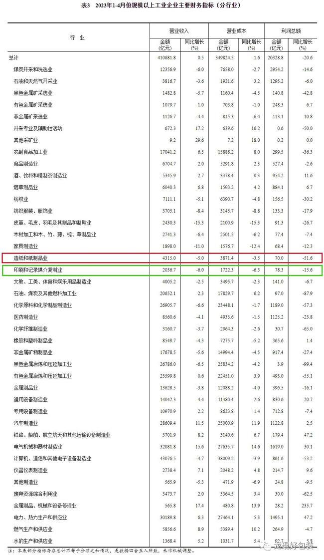 在41個工業大類行業中,13個行業利潤總額同比增長,1個行業持平,27個行業下降。其中,造紙和紙制品業實現利潤總額70.0億元,同比下降51.6%;印刷和記錄媒介復制業實現利潤總額78.3億元,同比下降15.6%。 在營業收入方面,2023年1-4月份,全國規模以上工業企業實現營業收入41.07萬億元,同比增長0.5%。其中,造紙和紙制品業實現營業收入4315.0億元,同比下降5.0%;印刷和記錄媒介復制業實現營業收入2036.7億元,同比下降6.0%。