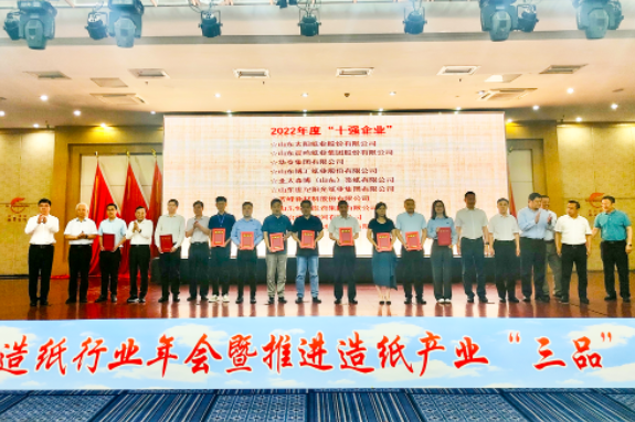 在頒獎環節,齊魯工業大學副校長、山東造紙學會理事長劉玉教授宣讀了《關于公布協會認定2022 年度“十強企業”的通報》,山東太陽紙業股份有限公司等十家企業被認定為山東省造紙行業協會“2022 年度‘十強企業’”。