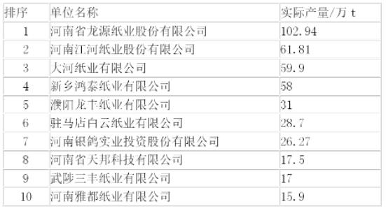 河南省造紙行業(yè)2022年運(yùn)行概況及2023年展望 李尚武 河南造紙學(xué)會(huì) 1 河南省造紙行業(yè)2022年概況 2022年河南省造紙行業(yè)平穩(wěn)增長,根據(jù)河南省統(tǒng)計(jì)局和河南省造紙學(xué)會(huì)對(duì)綜合信息資料調(diào)查,全省制漿造紙及紙制品生產(chǎn)企業(yè)約270家,機(jī)制紙及紙板生產(chǎn)企業(yè)約80家,實(shí)際總產(chǎn)量398萬t,同比增長-0.4%;營業(yè)收入499.48億元(包括紙制品),同比增長3.1%;利潤總額21.89億元,同比增加94.8%。2022年全省機(jī)制紙及紙板總產(chǎn)量與2021年同比有所減少、營業(yè)收入有所增加、利潤總額增加明顯。 河南省造紙企業(yè)主要分布在新鄉(xiāng)、焦作、濮陽、周口、駐馬店、鄭州等地區(qū)。2022年,全省造紙企業(yè)年生產(chǎn)能力超過10萬t的企業(yè)23家,這些企業(yè)的總產(chǎn)量占全省總產(chǎn)量85%以上;麥草等非木漿造紙產(chǎn)量約25萬t,約占全省總產(chǎn)量的6.3%,廢紙漿造紙產(chǎn)量約158萬t,約占全省總產(chǎn)量的39.7%;木漿造紙產(chǎn)量約215萬t,約占全省總產(chǎn)量的54.0%。主要產(chǎn)品中:文化用紙、特種紙、生活用紙等產(chǎn)量約215萬t,箱紙板產(chǎn)量約60萬t,瓦楞原紙產(chǎn)量約98萬t。 全省所有制漿造紙企業(yè),全部按省和地方生態(tài)環(huán)境部門要求達(dá)標(biāo)排放,很多企業(yè)排放標(biāo)準(zhǔn)超過國家、地方生態(tài)環(huán)境部門標(biāo)準(zhǔn)。部分重點(diǎn)骨干企業(yè)生產(chǎn)能力和經(jīng)濟(jì)效益有所增加。 河南省重點(diǎn)造紙企業(yè)2022年完成總產(chǎn)量、營業(yè)收入、利潤總額、利稅總額前十名企業(yè)情況如表1~表4所示。 表1 2022年河南省總產(chǎn)量前十名的造紙企業(yè)