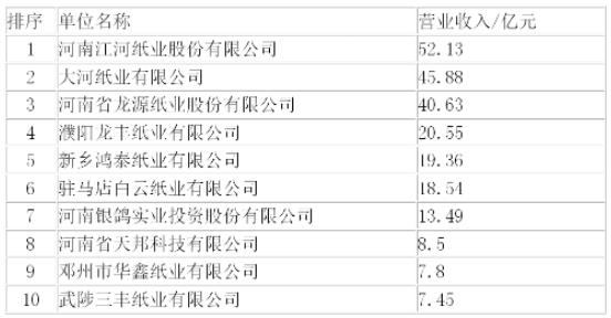 表2 2022年河南省營業(yè)收入前十名造紙企業(yè)