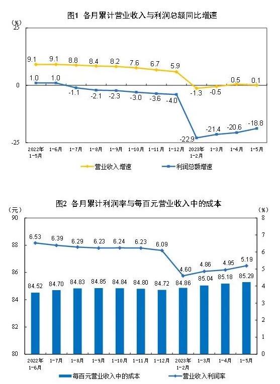 1—5月份,規模以上工業企業實現營業收入51.39萬億元,同比增長0.1%;發生營業成本43.83萬億元,增長1.2%;營業收入利潤率為5.19%,同比下降1.21個百分點。其中,造紙和紙制品業實現營業收入5379.4億元,同比下降5.4%;印刷和記錄媒介復制業實現營業收入2521.2億元,同比下降6.3%。 5月末,規模以上工業企業資產總計159.24萬億元,同比增長6.8%;負債合計91.41萬億元,增長7.2%;所有者權益合計67.83萬億元,增長6.2%;資產負債率為57.4%,同比上升0.2個百分點。 5月末,規模以上工業企業應收賬款22.37萬億元,同比增長11.7%;產成品存貨6.14萬億元,增長3.2%。 1—5月份,規模以上工業企業每百元營業收入中的成本為85.29元,同比增加0.93元;每百元營業收入中的費用為8.31元,同比增加0.30元。 5月末,規模以上工業企業每百元資產實現的營業收入為78.1元,同比減少5.8元;人均營業收入為170.9萬元,同比增加5.8萬元;產成品存貨周轉天數為20.7天,同比增加1.0天;應收賬款平均回收期為63.6天,同比增加6.4天。 5月份,規模以上工業企業實現利潤總額6358.1億元,同比下降12.6%。 國家統計局工業司統計師孫曉解讀工業企業利潤數據表示,5月份,隨著工業生產繼續恢復,工業企業利潤降幅持續收窄,企業效益狀況呈現以下主要特點:一是工業企業利潤降幅持續收窄。二是裝備制造業利潤保持較快增長,工業企業利潤行業結構持續改善。三是消費品制造業利潤降幅收窄,助推工業企業利潤改善。四是電氣水行業利潤保持快速增長。五是不同規模企業利潤均有改善。總體看,工業企業利潤延續恢復態勢,但也要看到,外部環境更趨復雜嚴峻,國內需求仍顯不足,制約企業利潤進一步恢復,工業企業效益恢復的基礎仍不牢固。