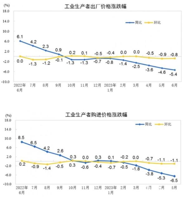 2023年6月份,全國工業生產者出廠價格同比下降5.4%,環比下降0.8%;工業生產者購進價格同比下降6.5%,環比下降1.1%。上半年,工業生產者出廠價格比上年同期下降3.1%,工業生產者購進價格下降3.0%。
