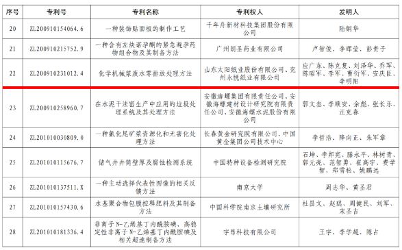 7月21日,國家知識產(chǎn)權(quán)局公布關(guān)于第二十四屆中國專利獎授獎的決定,太陽紙業(yè)“化學機械漿廢水零排放技術(shù)處理方法”專利斬獲中國專利優(yōu)秀獎,這是公司繼2021年“一種桉木溶解漿的制備工藝”專利后,再次斬獲中國專利優(yōu)秀獎。