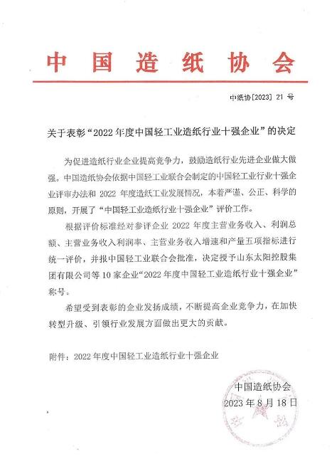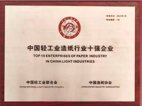 根據(jù)評(píng)價(jià)標(biāo)準(zhǔn)經(jīng)對(duì)參評(píng)企業(yè)2022年度主營(yíng)業(yè)務(wù)收入、利潤(rùn)總額、主營(yíng)業(yè)務(wù)收入利潤(rùn)率、主營(yíng)業(yè)務(wù)收入增速和產(chǎn)量五項(xiàng)指標(biāo)進(jìn)行統(tǒng)一評(píng)價(jià),并報(bào)中國(guó)輕工業(yè)聯(lián)合會(huì)批準(zhǔn),確定了 “2022年度中國(guó)輕工業(yè)造紙行業(yè)十強(qiáng)企業(yè)”排名。