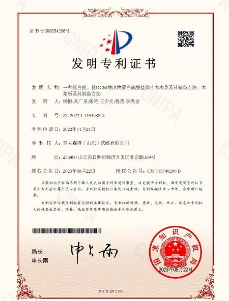 8月22日,亞太森博(山東)漿紙有限公司申請的發明專利ZL202211454988.X《一種低白度、低DCM抽出物漂白硫酸鹽闊葉木木漿及其制備方法、木漿板及其制備方法》順利通過國家知識產權局審查并獲得授權。