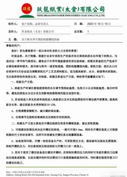 秋冬季節(jié)來臨,為避免由于外界環(huán)境溫濕度的變化給紙板、紙箱及彩盒的生產(chǎn)造成不必要的麻煩和損失,玖龍紙業(yè)近期發(fā)布了《關(guān)于秋冬季節(jié)預(yù)防紙箱爆線的函》,希望能與廣大包裝企業(yè)采取措施預(yù)防紙箱爆線問題。