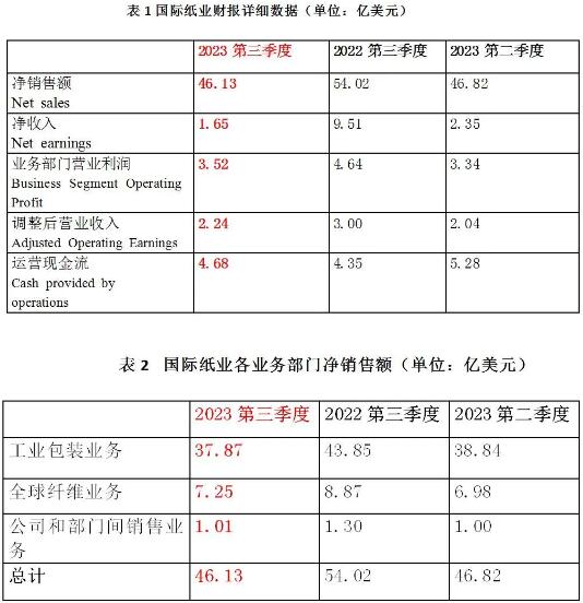 10月26日,美國國際紙業公布了2023年第三季度財報,凈收入、銷售額雙雙下滑,報告顯示: ◆國際紙業2023年第三季度凈收入(netearnings)為1.65億美元,相比去年第三季度(9.51億美元)下降了82.6%; ◆第三季度調整后營業收入(adjustedoperatingearnings)2.24億美元,相比去年同期下降了25.3%; ◆第三季度凈銷售額46.13億美元,相比去年同期(54.02億美元)下降了14.6%; ◆第三季度運營提供的現金流為4.68億美元,年初至今共達到13億美元; ◆第三季度向股東返還了1.6億美元,年初至今共向股東返還金額達到6.79億美元。 ◆以5.08億美元的價格出售了與俄羅斯Ilim集團合資企業的股份,完成了股權剝離。 詳細數據請見下表: