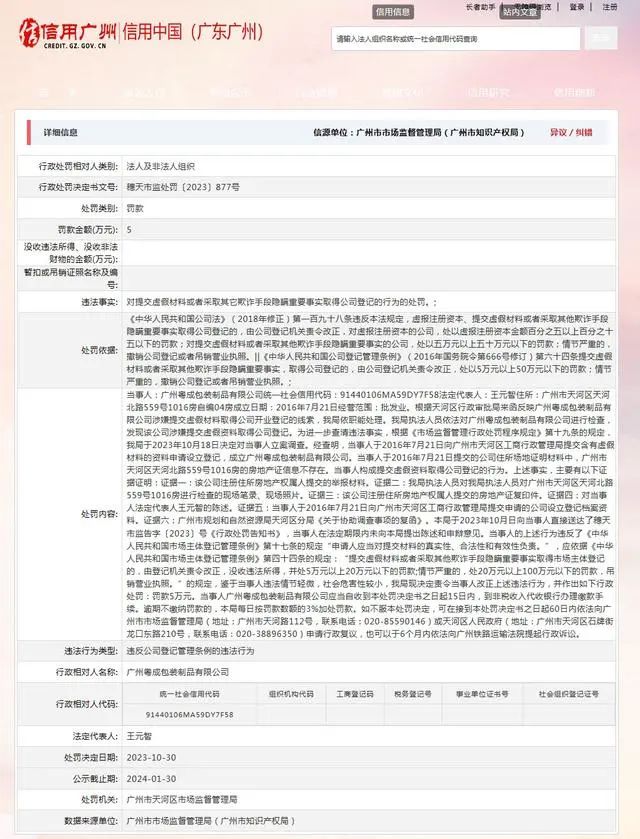 近日,信用中國(廣東廣州)網(wǎng)站發(fā)布行政處罰信息【行政處罰決定書文號:穗天市監(jiān)處罰〔2023〕877號】,涉及廣州粵成包裝制品有限公司。該公司提交虛假資料取得公司登記被處罰。
