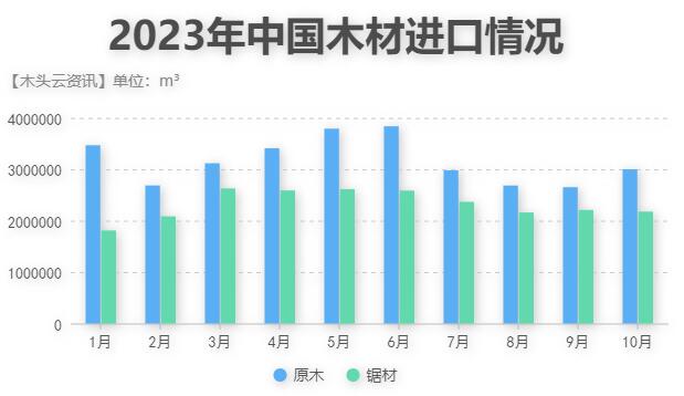 根據中國海關總署日前發布的數據顯示,今年1-10月,中國木材進口數量同比減少了5%,共計5484萬m3,價值總額同比下降11.2%至780億;但10月的木材進口情況有所回升,數量環比增長了6.3%,共計517.8萬m3,價值金額環比增長3%至70億。