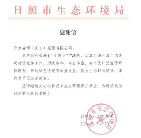 2月20日,日照市生態環境局向公司發來感謝信,對公司積極踐行“生態立市”戰略、認真組織生態文明建設宣傳工作、向市民廣泛宣傳環保理念、推動城市綠色低碳高質量發展、助力生態日照建設等方面的貢獻表示感謝。