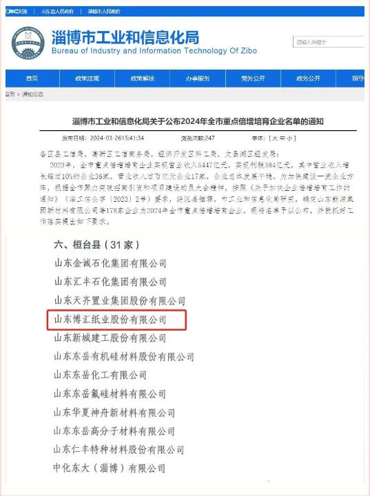 2024年3月25日,淄博市工業(yè)和信息化局公布2024年全市重點(diǎn)倍增培育企業(yè)名單,全市共178家,其中桓臺(tái)縣31家,山東博匯紙業(yè)股份有限公司入選重點(diǎn)倍增培育企業(yè)名單。